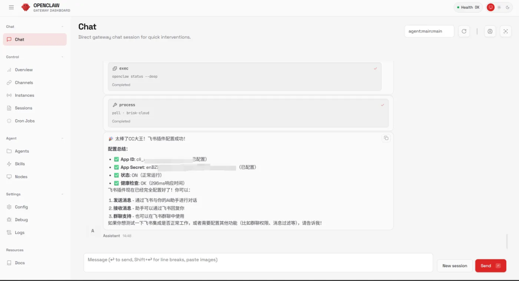 如果等很久仍不行,优先检查 OpenClaw 网关是否正常运行,并查看日志(下面第四部分给了命令)