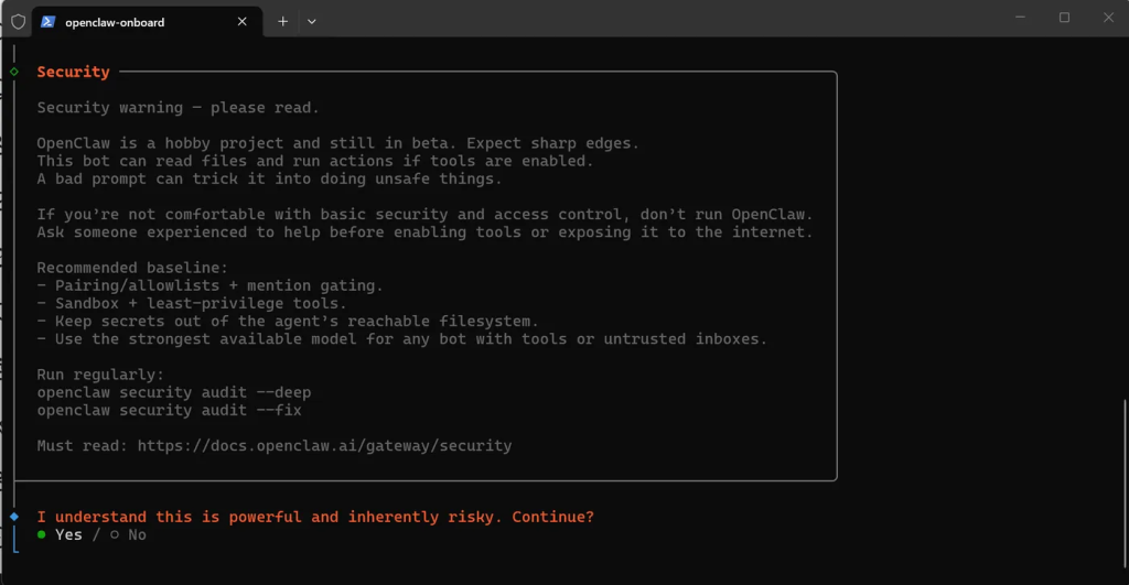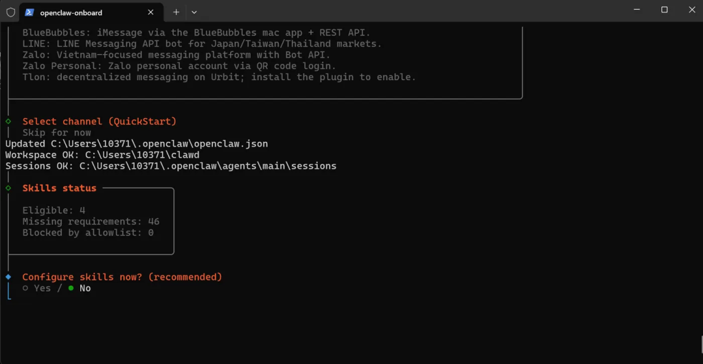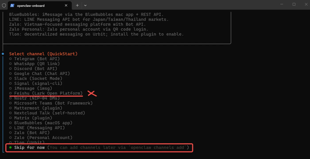 接着配置通讯工具,虽然官方这里直接可以选飞书,但官方文档明确建议 Windows 通过 WSL2 运行,并且提到原生 Windows 未测试、更容易出问题。并且我实测这里下载插件会报错,所以我们这里先跳过,后续再安装。