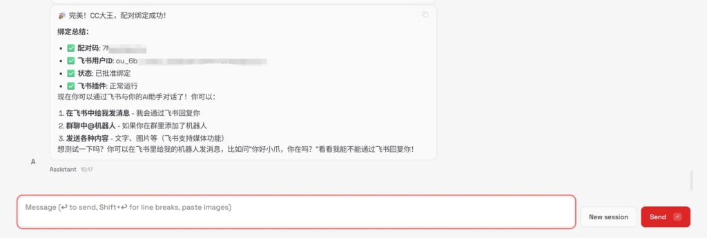 复制这个配对码,打开 Clawdbot 的 Web UI(就是前面那个控制台),把配对码发给它,Clawdbot 会自动完成绑定。