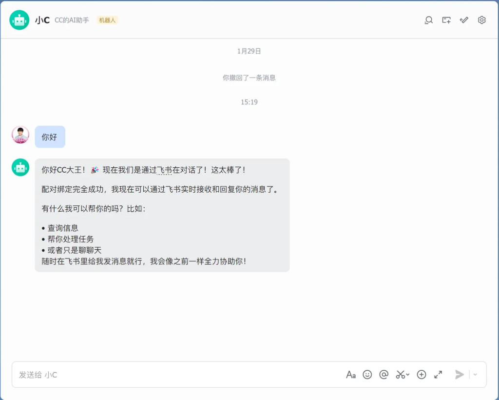 绑定成功后,你就可以在飞书里跟 Clawdbot 愉快交流了,也可以把机器人拉到公司群里,让所有小伙伴都能用。