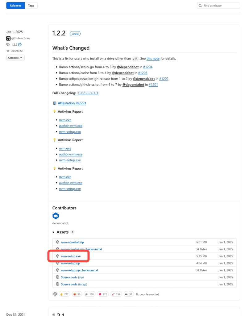 Windows 用户到 GitHub Releases 下载 nvm-setup.exe:https://github.com/coreybutler/nvm-windows/releases
